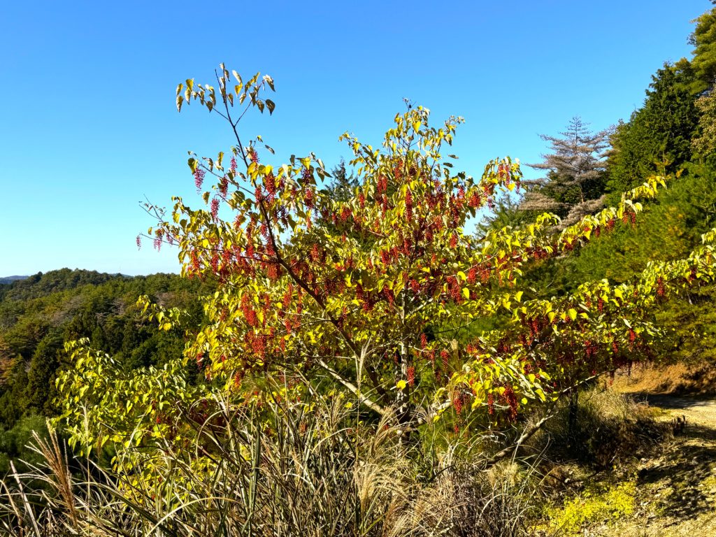 進みゆく山側に花芽を着けたミツマタ(三椏)が続いている…薄黄色の花を咲かせた春先の情景が浮かぶ