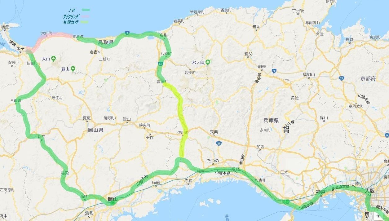1日目のJRの行程: (大和路快速)~10:51大阪11:00(新快速姫路行)~12:02姫路12:05(播州赤穂行)~12:24相生12:26(岡山行)~13:37岡山 {昼食タイム} 岡山14:20(伯備線新見行)~16:05新見16:24(西出雲行)~18:04伯耆大山