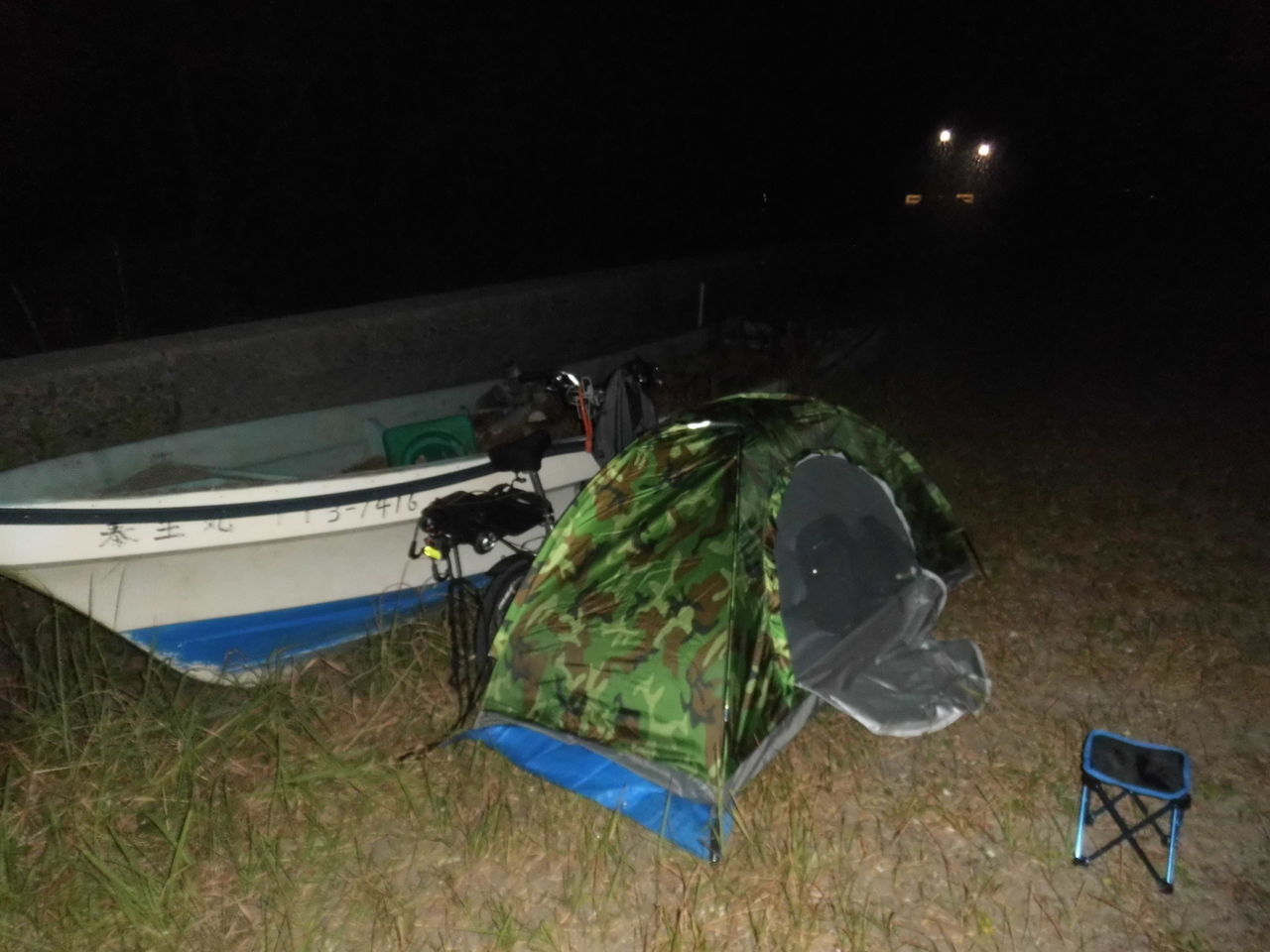 Googleストリートビューで見えていた廃船の傍にテントを設置しました。流星観察はこの前にシートを敷いて横になり空を眺めましたが、眠くなると中で仮眠。