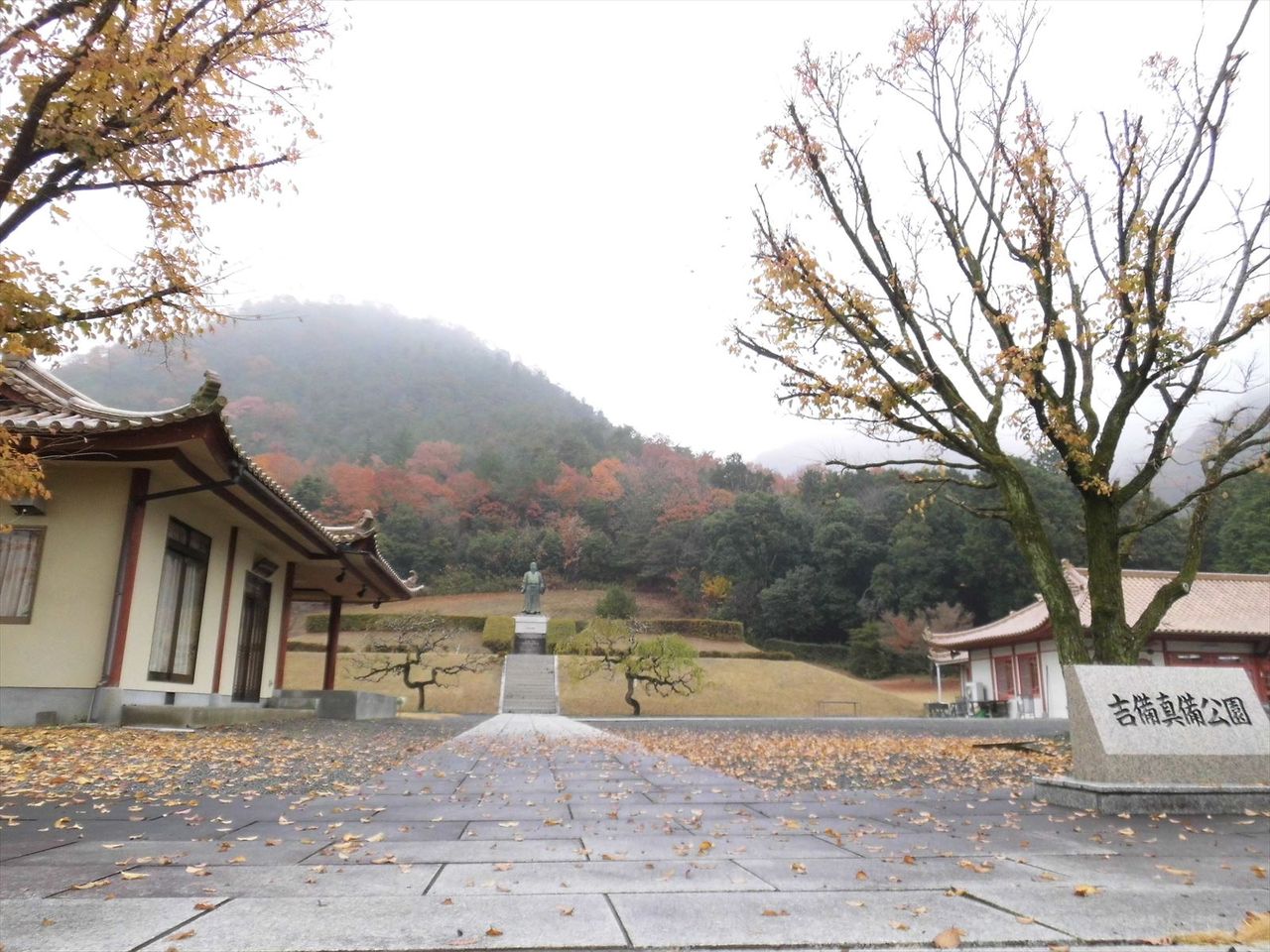 真備像の右奥には前方後円墳を模した「古代の丘」がある。
