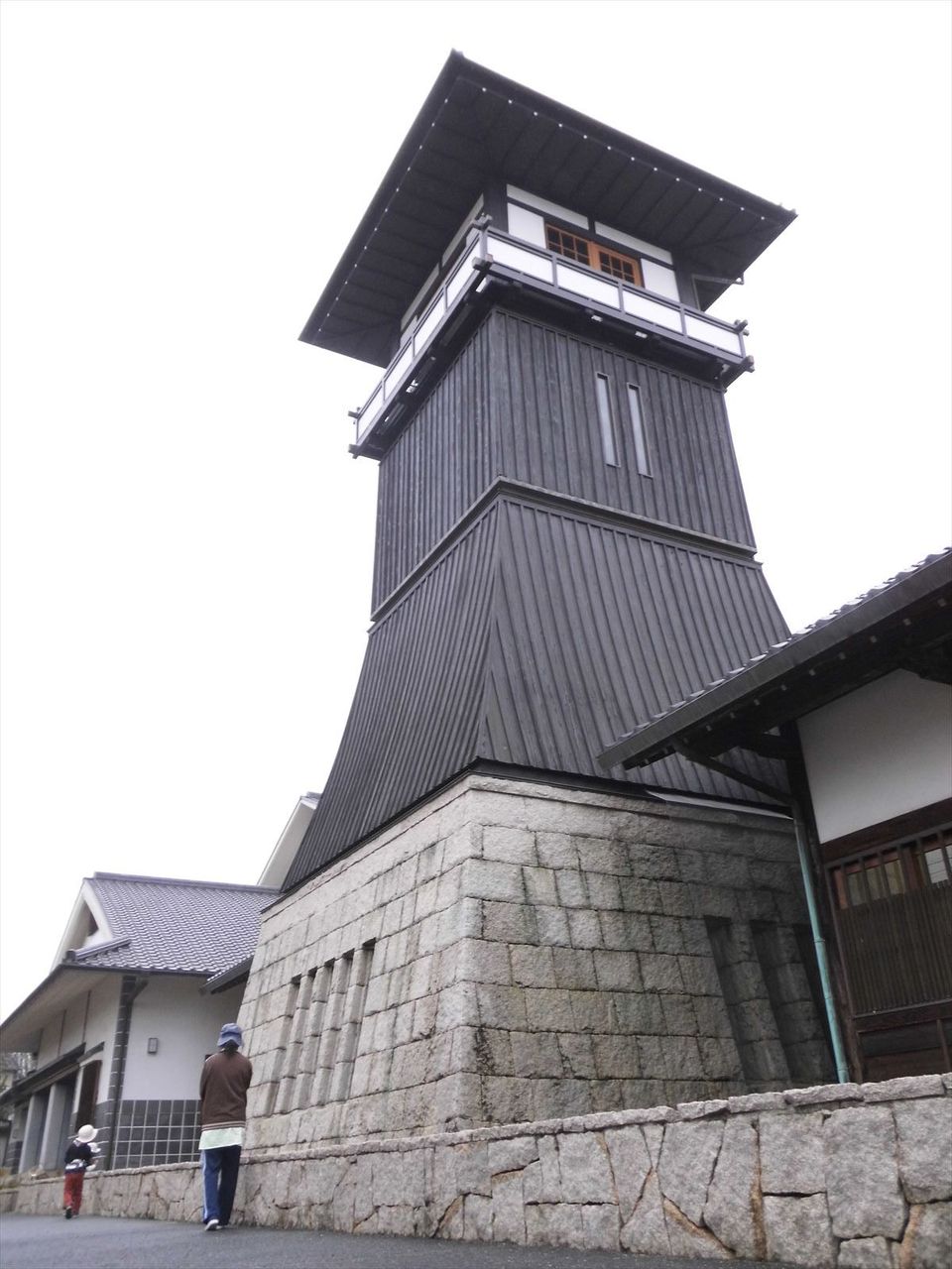 やぐらは高さ16m、この日は雨に煙る町の眺め。途中の階に過去の水害の写真が掲示されてあった。