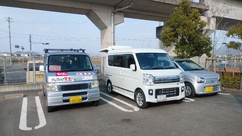 周りはいつもどおりの車中泊らしい乗用車と、トラックの列。お隣のワゴンも銀マットの窓カバーで既にお寝みの様子。