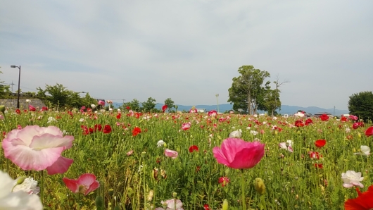 以前、巣山古墳に隣接する南エリア「春まちの丘」を鮮やかに赤く染めていたチームと、色とりどりの混在チームに分かれてお花畑で咲き競っていたポピーたち、まだ頑張ってるかなと南エリアから散策することに。