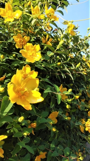 上は、ビヨウヤナギ(美容柳)。 下は、よく似た小型のキンシバイ(金糸梅)。まだツボもが多い中に一輪咲いていました。