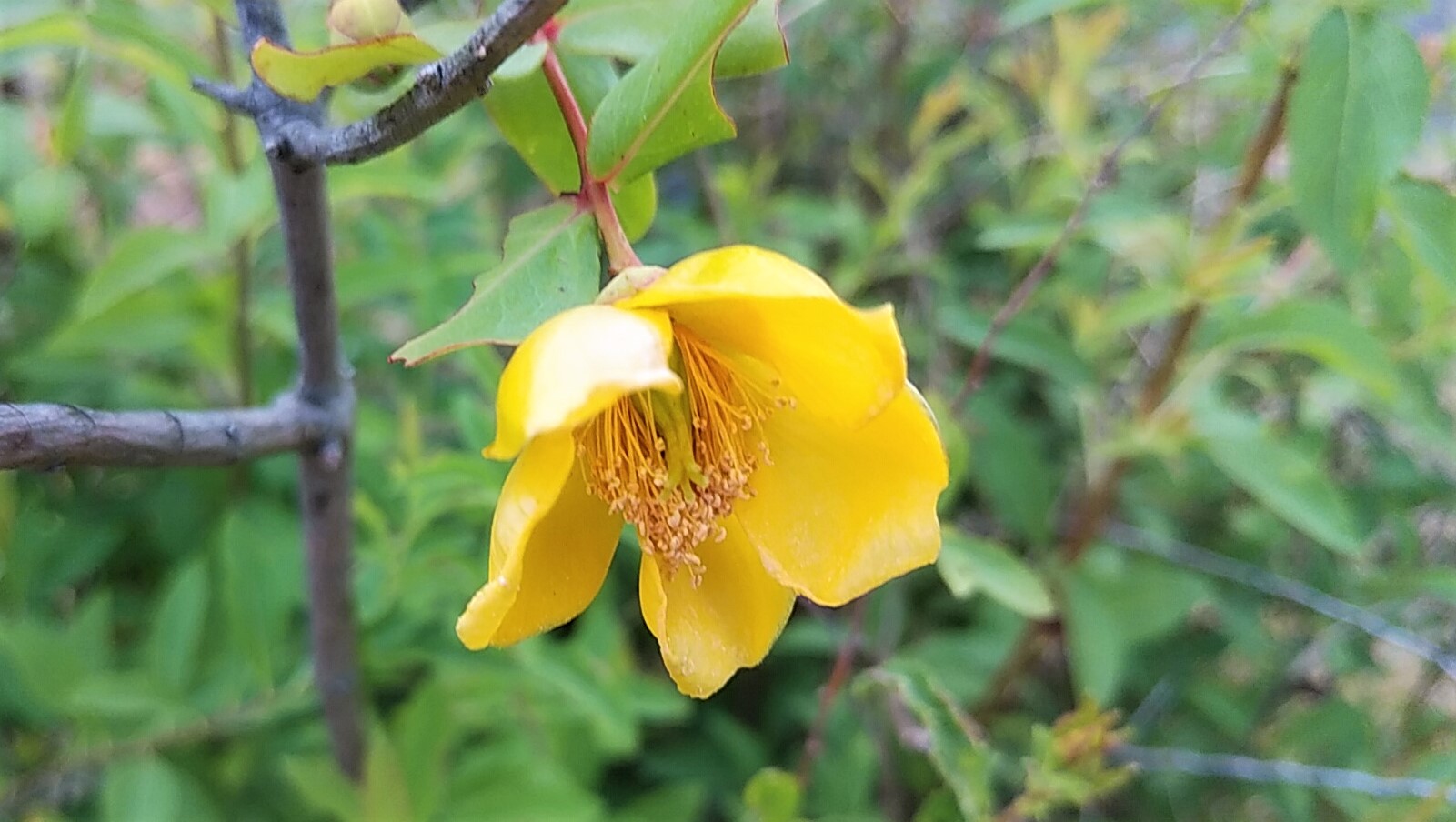 上は、ビヨウヤナギ(美容柳)。 下は、よく似た小型のキンシバイ(金糸梅)。まだツボもが多い中に一輪咲いていました。