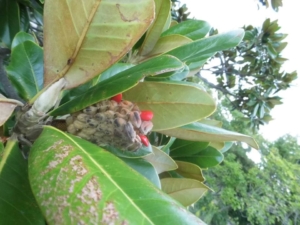夏に、大きな白い花を咲かせていたタイサンボク(泰山木)が、パイン状の硬い果穂(集合果)を着けている。