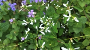 アゲラタムの薄紫に、白い変わった形の花びらユーフォルビア・ダイアモンドフロスト