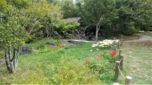 広場の小川から東にかけて、赤い彼岸花と、植栽されたシロバナマンジュシャゲ(白花彼岸花)が絨毯のように。