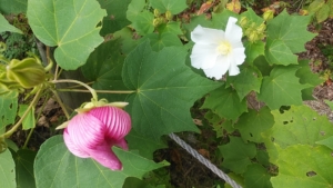 ワタ (綿) 芙蓉やオクラと同じアオイ科で朝咲いて夕方には萎む1日花、開花して萎むまでの色の変化が面白い。