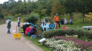 花サポーターやグループの花壇も作業中だったり、終えたチームも。