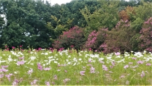 公園館向かいの「芝生の丘」はコスモスの丘にへんし~ん。ピンクのサルスベリの花とのコントラストがいいですね!