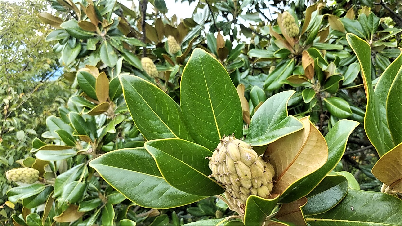 夏に、大きな白い花を咲かせていたタイサンボク(泰山木)が、パイン状の硬い果穂(集合果)を着けている。