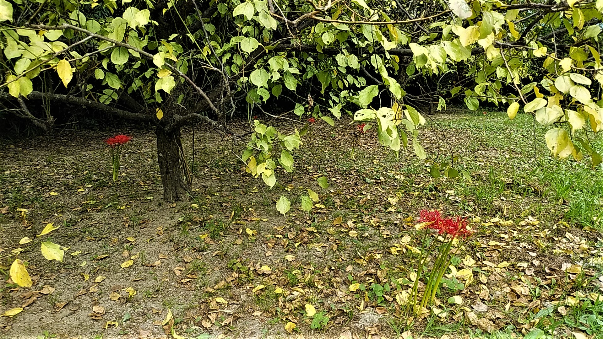 広場の小川から東にかけて、赤い彼岸花と、植栽されたシロバナマンジュシャゲ(白花彼岸花)が絨毯のように。
