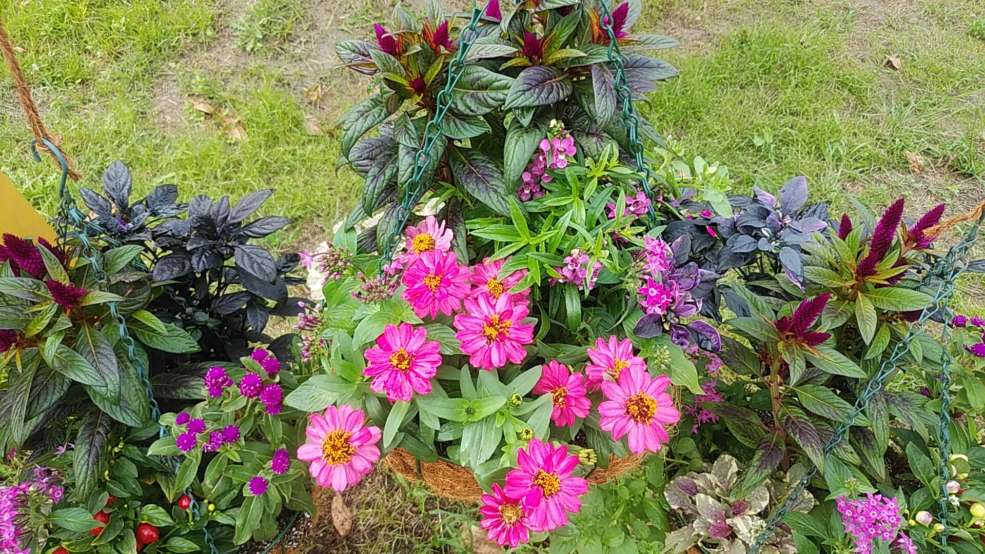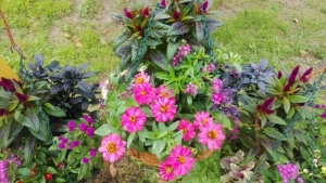 ジニア(百日草)の紅色トーンが、寄植えをより一層華やかに盛り立てているようですね。