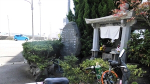 キャンプ場を離れて波止浜へ戻る途上、「波方港北」のバス停広場の傍ら、岩の上のお地蔵様。水分摂取の小休止を兼ねてお参り。横に「弘法岩由来」と彫り込んだ石碑。読みとりにくいのでパス。