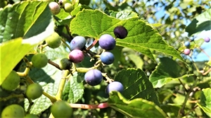 見上げる場所の山側の広場で小休止。ツタ性の植物に長径8cmほどの硬い実、なんだろう?落書きの絵、、もまた不明??教えてほしい!、、けど。