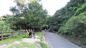 この道は、距離は有るがそれ程傾斜はきつくない。これまで時々前後して走っていた女の子二人は、間違ったのかもしれないが、橋下すぐで、傾斜の有るバイク用道を押して上がって行った。距離は半分程度になるので、あるいは、、、、。