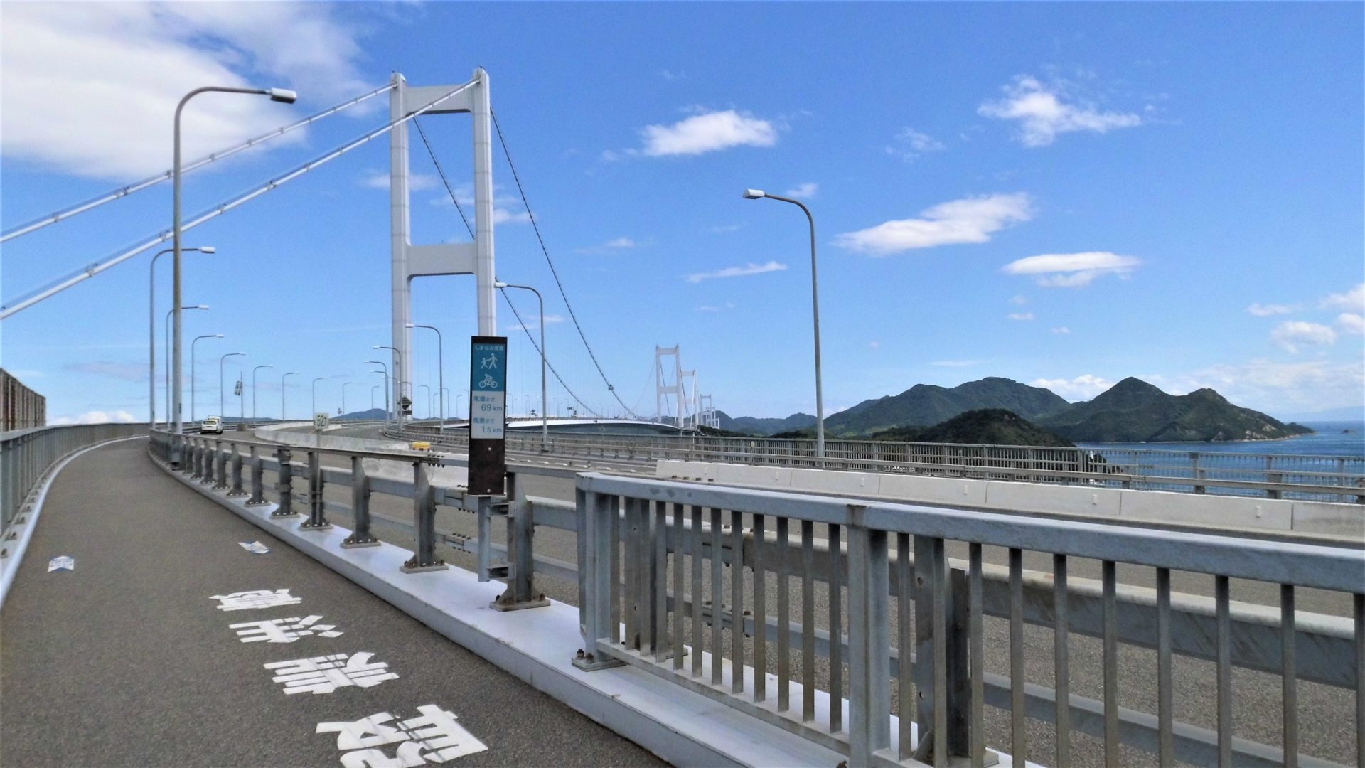 そして、いよいよ世界初の3連吊り橋として知られる「来島海峡大橋」全長4,100mに進入! 前方に「尾道まで69km 馬島まで1.5km」と掲示さている。