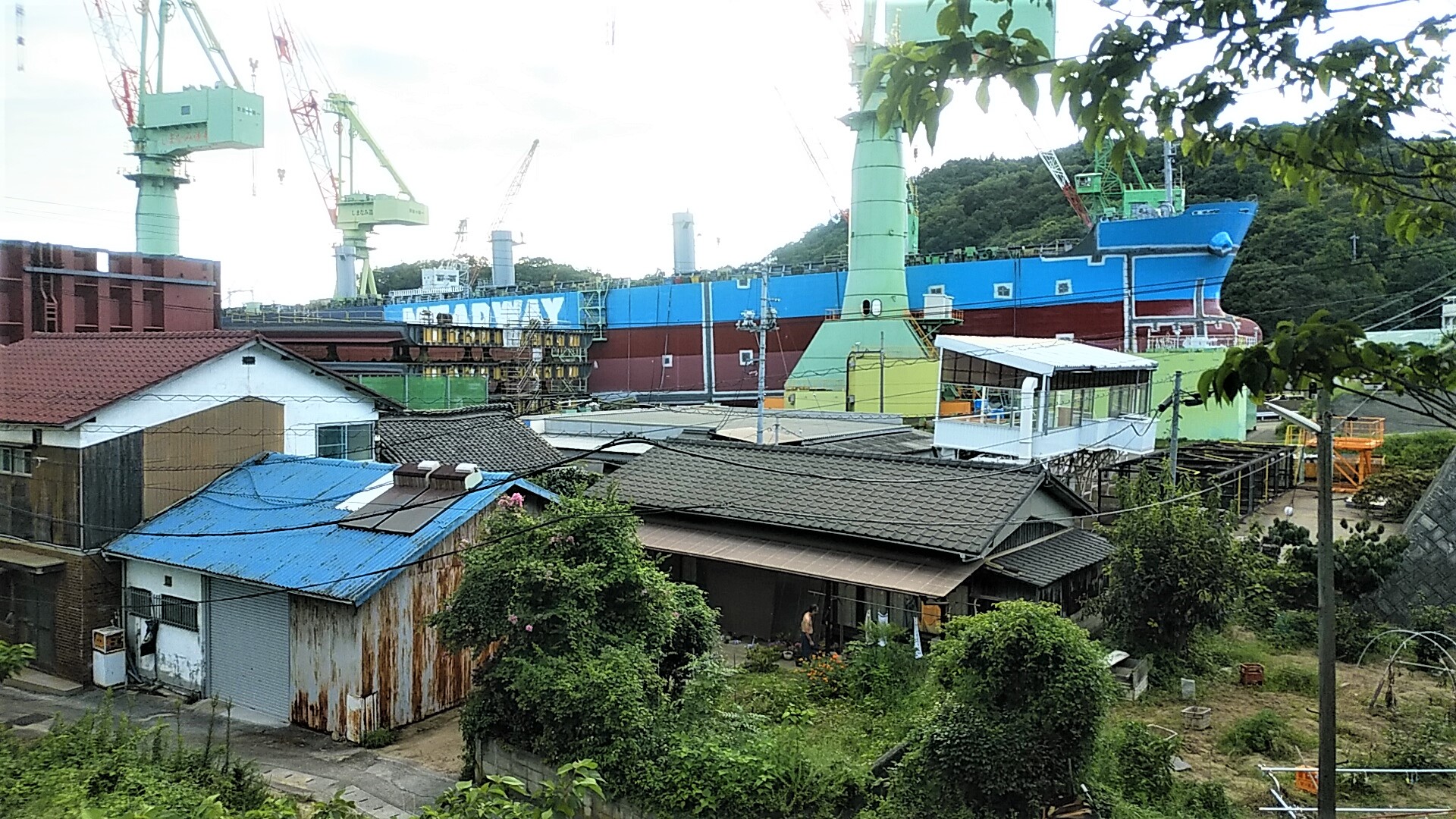 「大島大橋」を渡り終え伯方島で再び “海路" から戻ってきた国道317号線に入り、「大三島橋」へ向かう。「しまなみ造船」のドックで大きな船が造られている。高い場所に船があるので、圧倒される感じ。