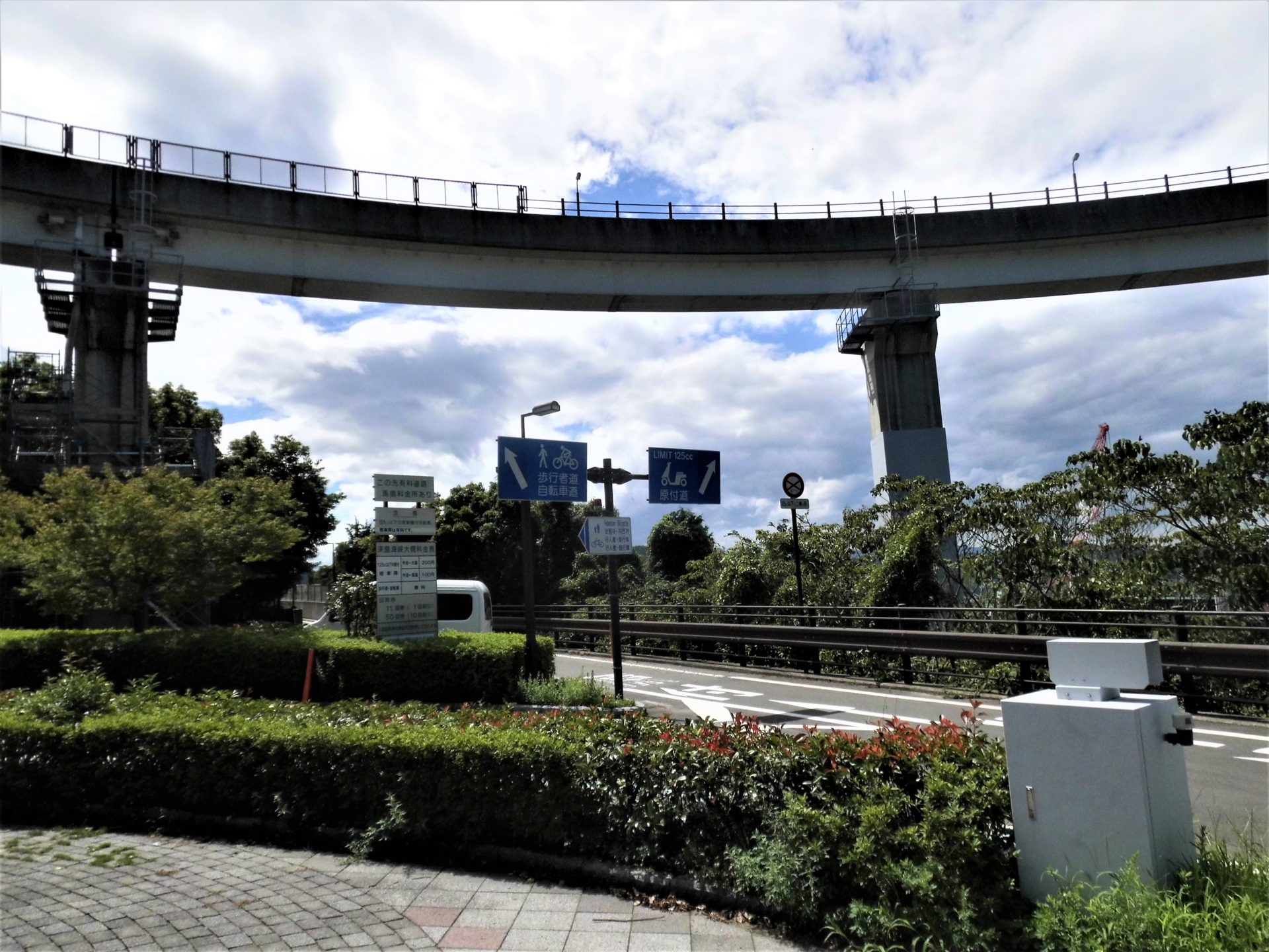 自転車・歩行者は看板の右手、下の写真の植え込みの間を進み、更にぐるりと1周して頭上のループ橋を進入すると「来島海峡大橋」左端の専用道へ。原付バイクは直進し、先でUターンする形で海峡大橋の右手の専用道へ進入。
