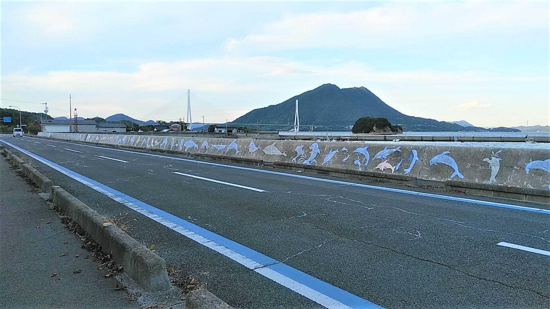 橋と生口島の島影、そして道沿い防波堤のドルフィン達。躍動するイルカたちのバリエーションと道路のラインとマッチングさせたかのような色あい、、、どなたの発想なのか、心和ませてくれ、旅の癒やしに感謝!
