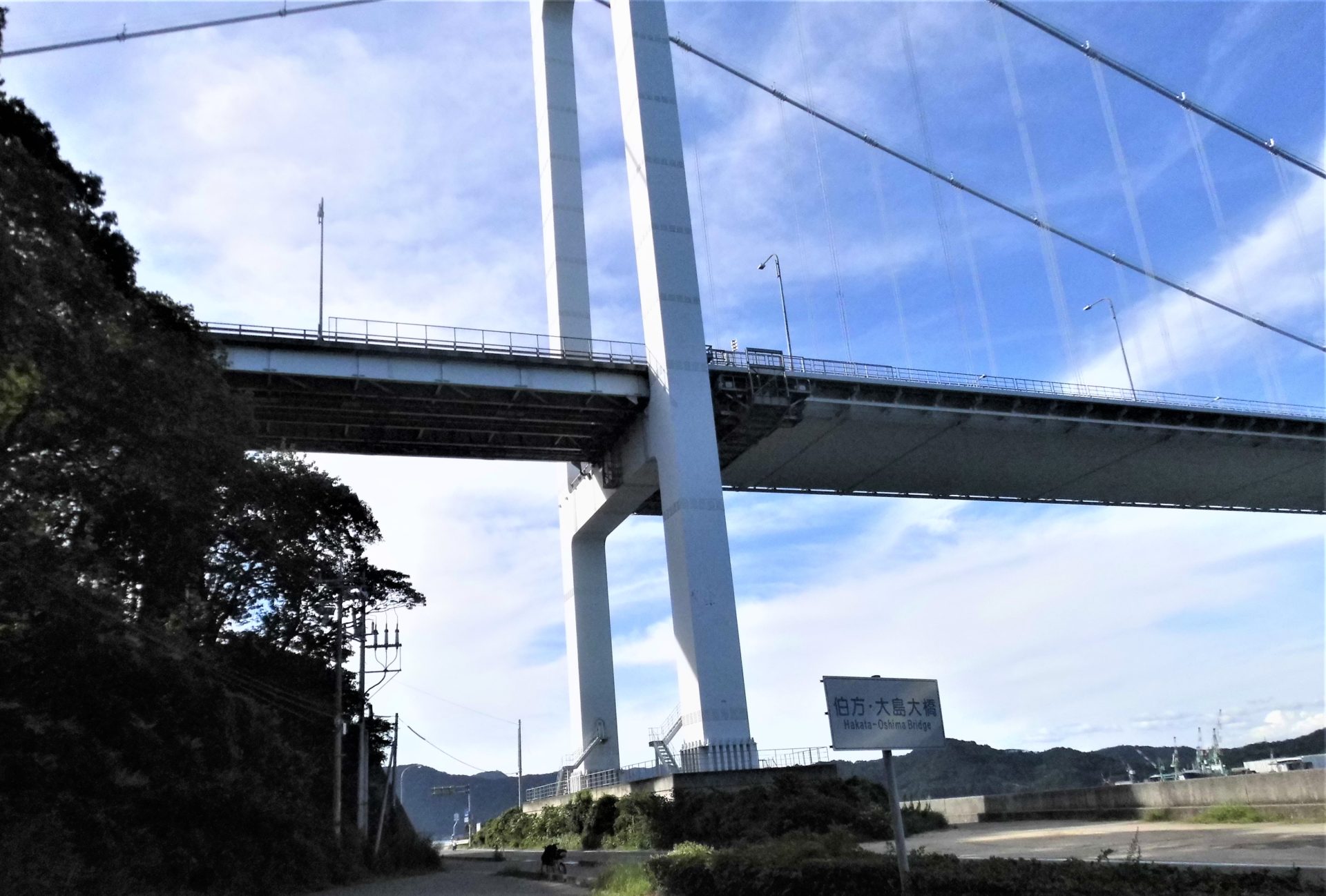 岬から東南の方向を望むと、波止浜から延びて手前の「小島」の向こう側、「馬島」を経て「大島」に第1、第2、第3大橋の世界初の3連吊り橋で掛かる「来島海峡大橋」が遠望でき、期待と橋への登坂の不安が交錯。