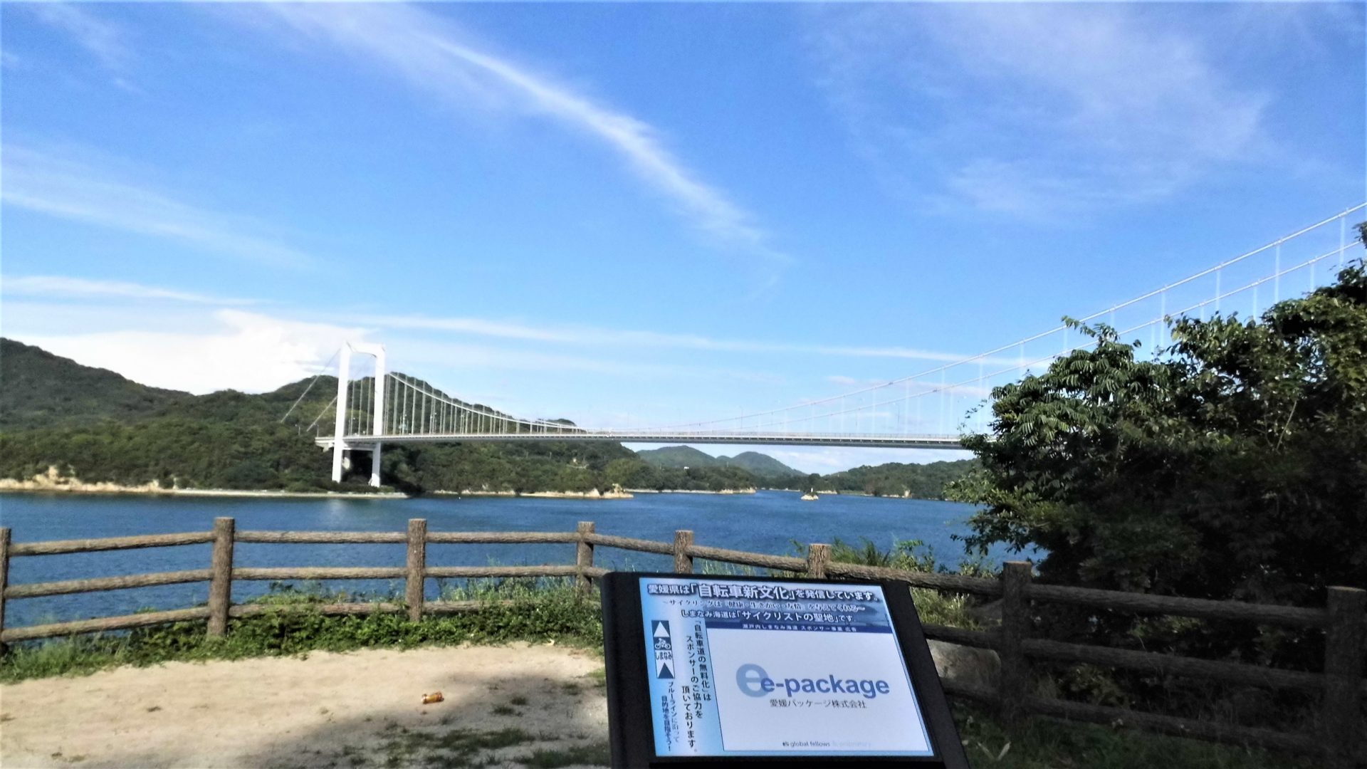 歩行者・自転車道の途中に見晴らし台。"「自転車道の無料化」はスポンサーのご協力を頂いております。“と記載され、「 e-package 愛媛パッケージ株式会社 」の表示。 有難うございます!!