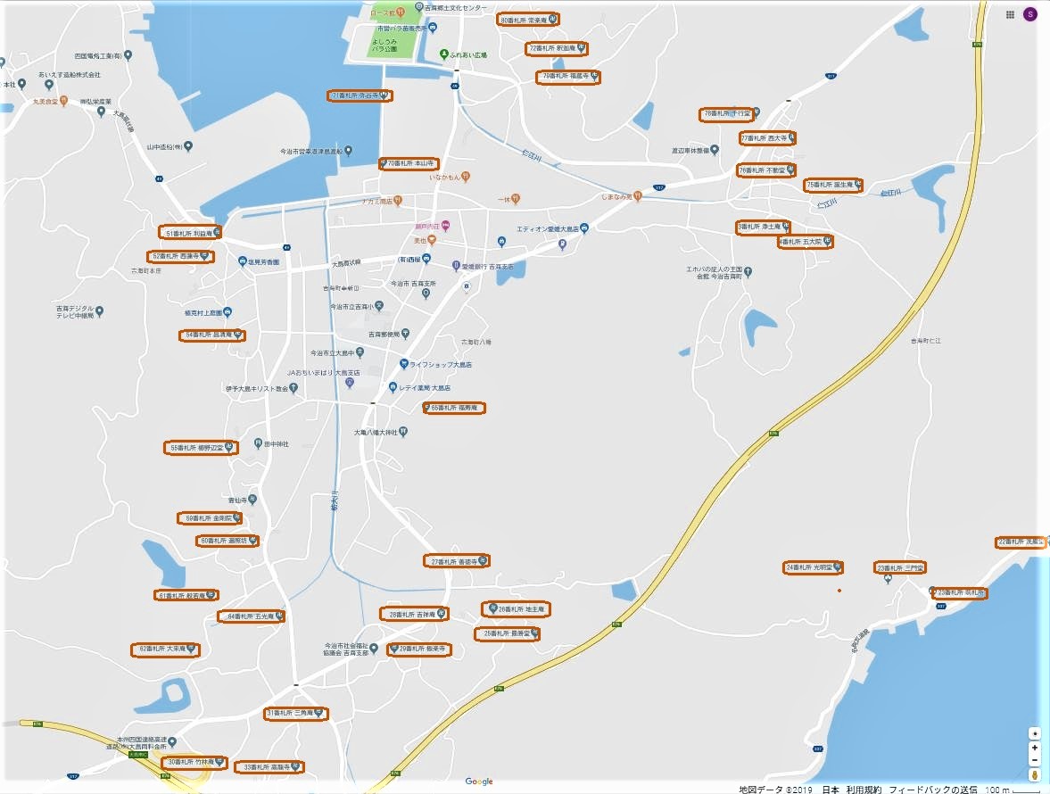 野草を眺めながら自転車を押して進み、峠でしまなみ海道をくぐり大島南インターのそばを進むと吉海町の町並み。寺や札所の案内板があり、伊予大島「島四国八十八ヶ所」霊場が各所に。Google mapでこの地域を見ると、下図のように霊場が表示される(分かり易いように枠で囲んだ)が、当然、画像範囲以外(上下左や右側の表示されていない宮窪町)にもたくさん霊場のお寺が在る。