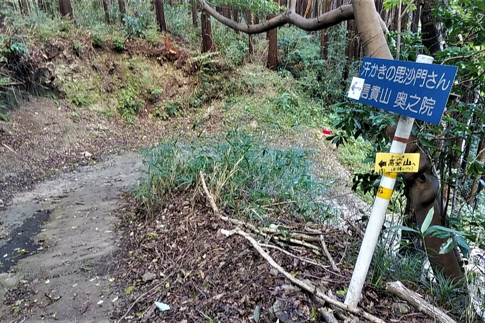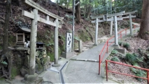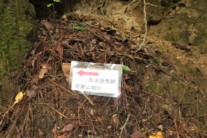 作業拠点から「松永屋敷跡」解説立札の前を登っていく。前回(9/28)にもこのルートで山頂の「空鉢護法堂」まで登り、鳥居の続く急坂参道を下山したが、この後に記載。