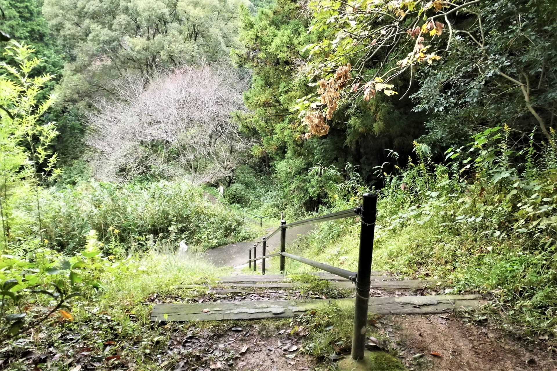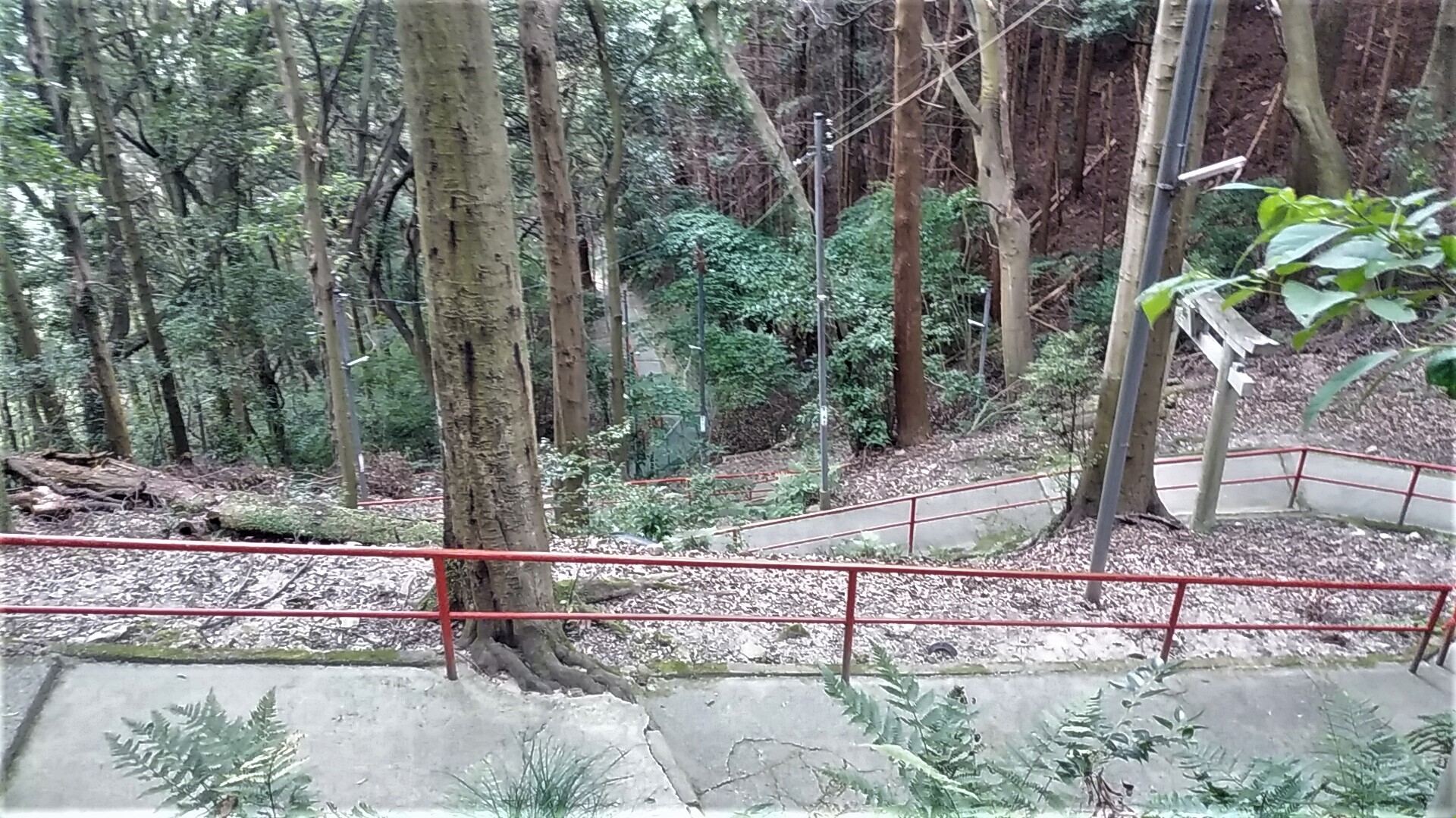 そして、終了後「信貴山城址石碑」の場所まで登り(脇道を見落とした!😅)また坂道を戻り、途中にある「高安山」方向へのルートを辿って、西側の「弁財天の滝」へ下りる急坂を通って「信貴山観光 i センター」先のバス停まで歩いた。