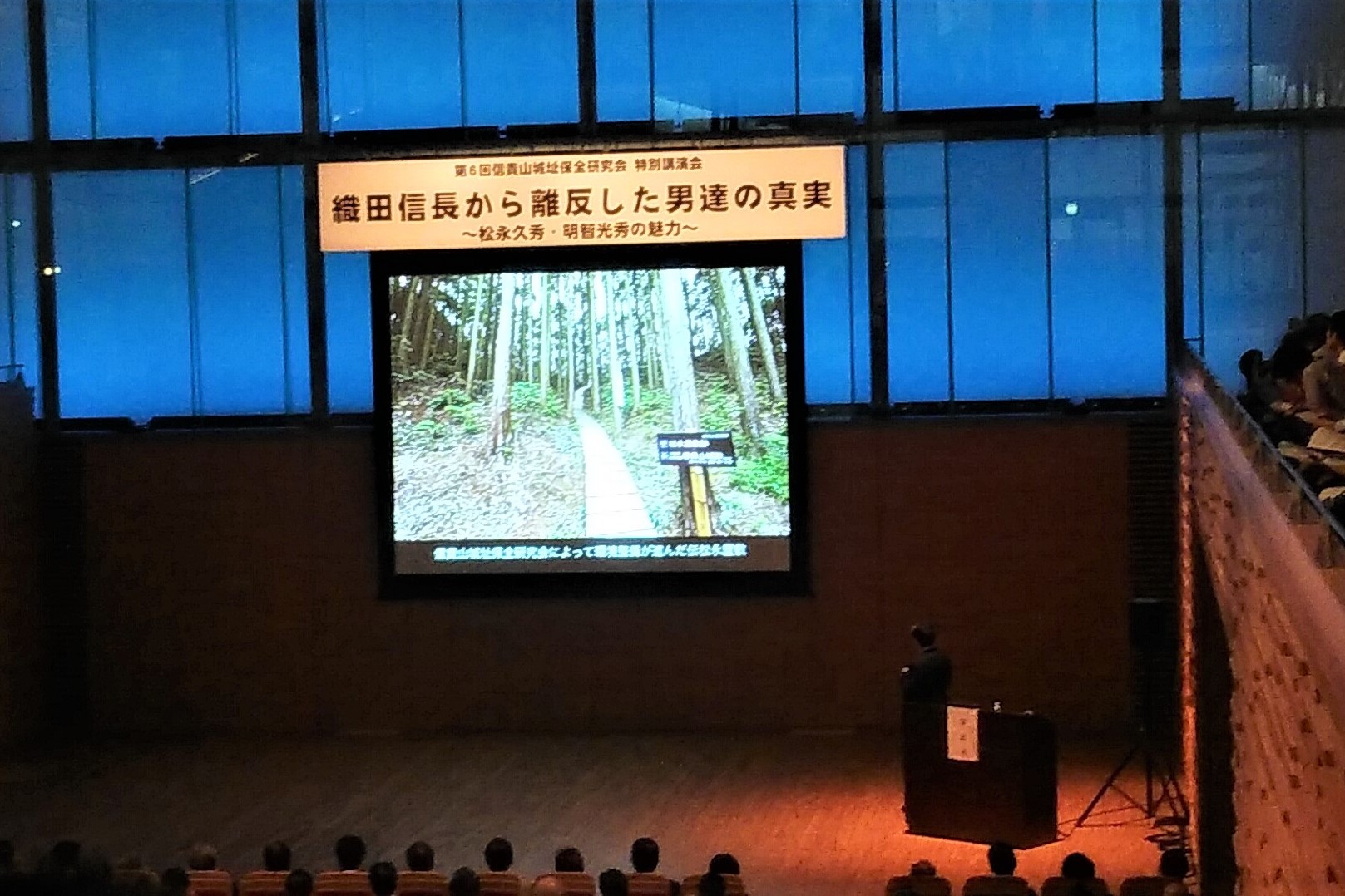 ご講演の中で、松永屋敷跡の状況を紹介し、信貴山城址保全活動のことも取り上げていただいた。