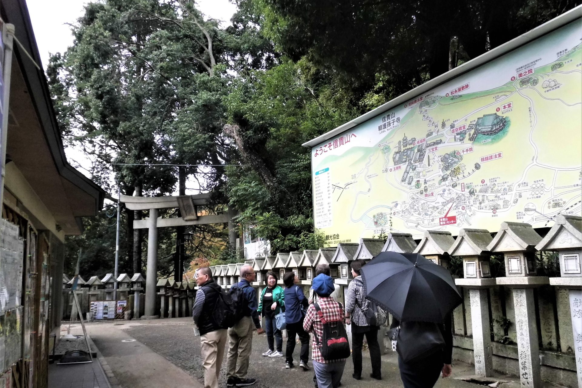 🔹「信貴山観光 i センター」の前に、大案内看板。松永屋敷跡保全活動メンバーは、センターの横に集合。