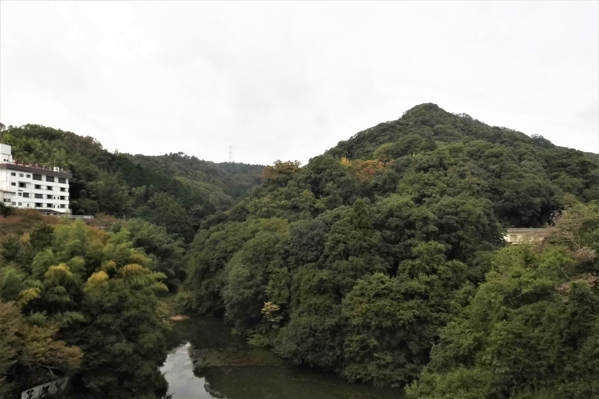 🔸橋の上から右手に信貴山山頂。三角錐状になっている部分が、頂部の「空鉢護法堂」までは急登。そして写真中央あたりの山麓に、「松永屋敷跡」からのハイキング道と、「高安山」のハイキング道が合流している地点。