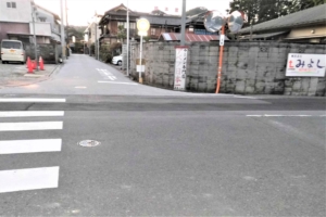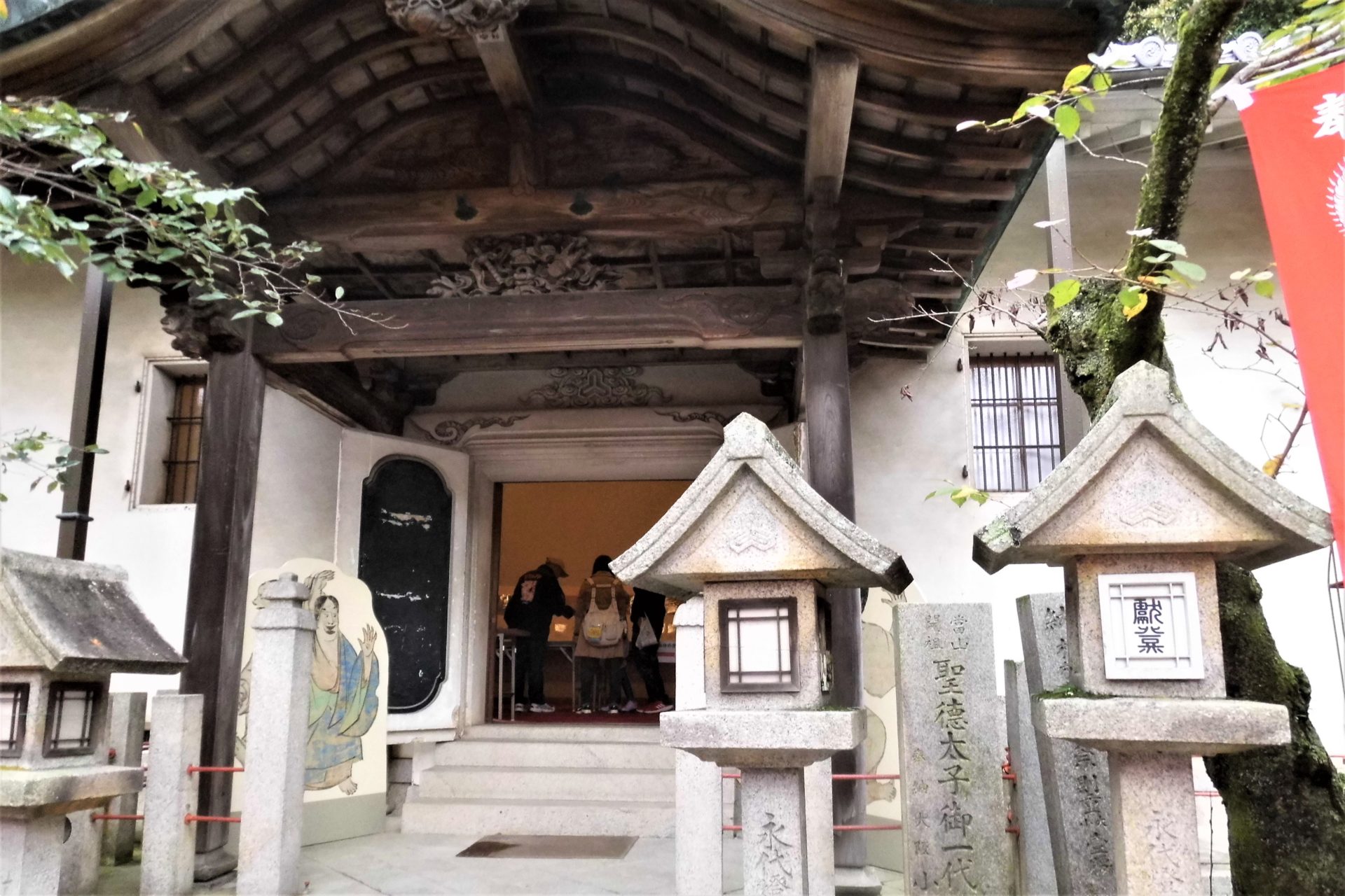 県道236号信貴山線を渡り、老舗旅館の並ぶ道を先へ。この県道、車の通行が多く、この場所の両側がカーブして見えにくいところなので、横断は要注意!