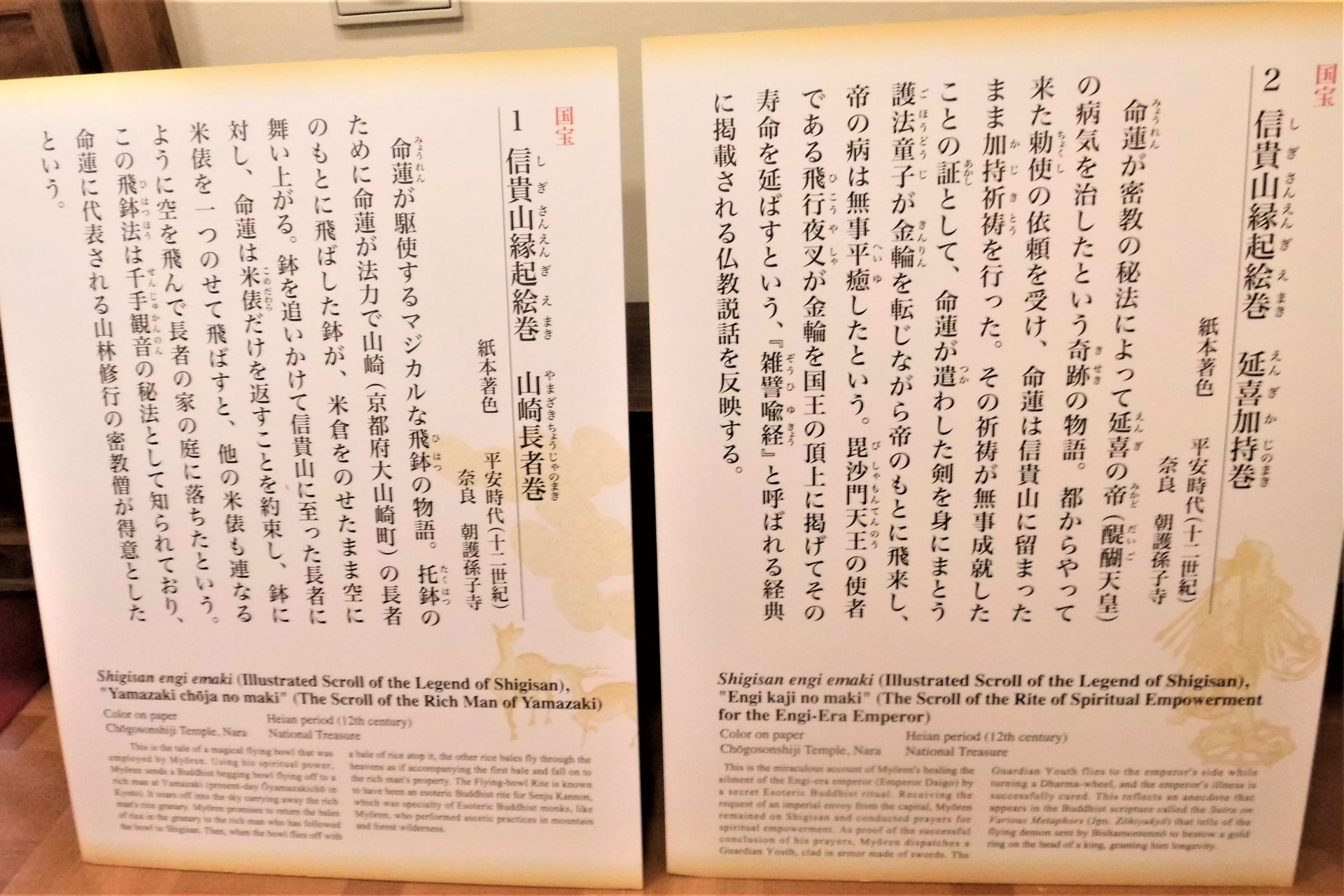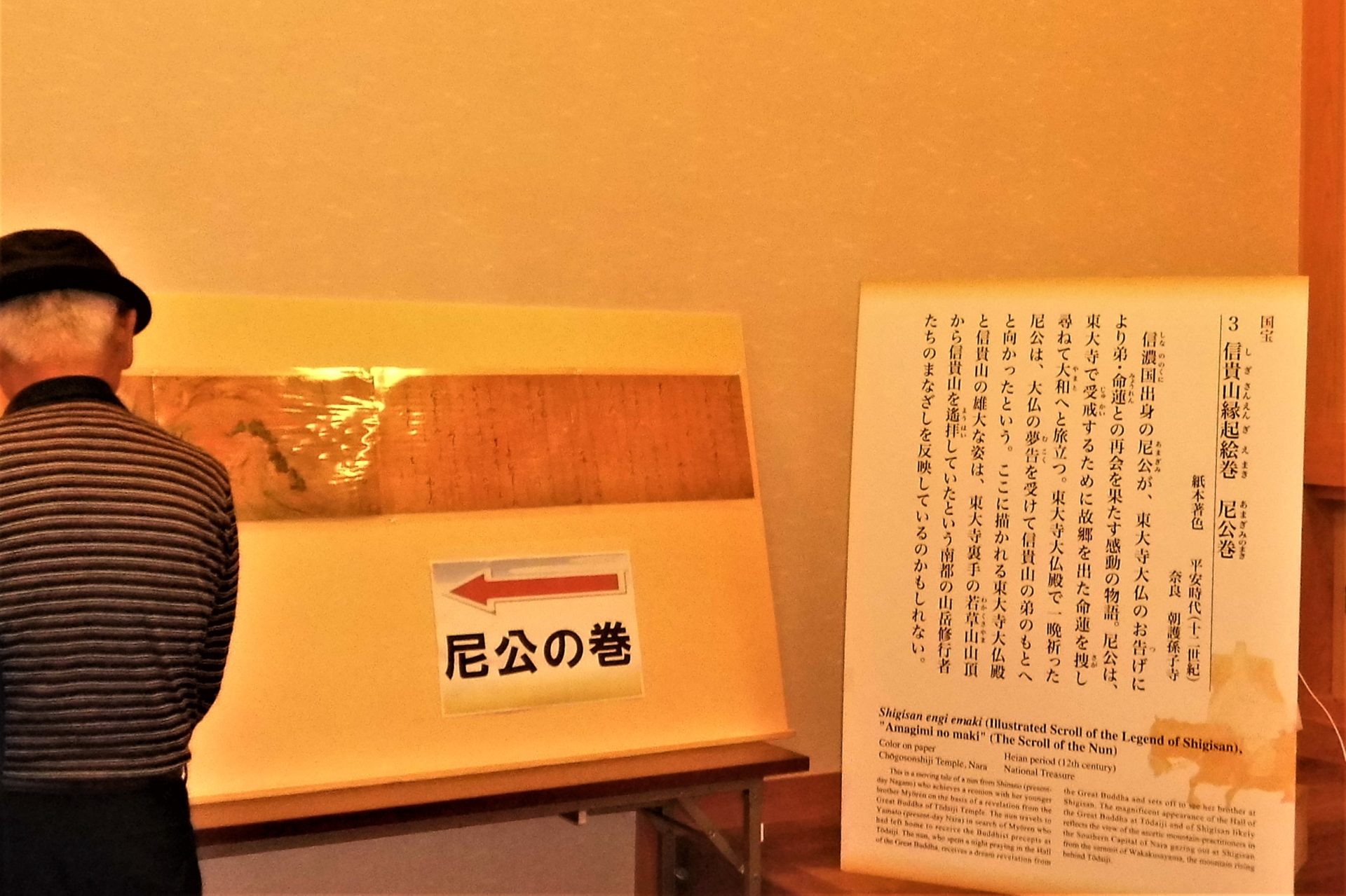 手前の「三宝荒神堂」隣の蔵?で国宝「信貴山縁起絵巻」の展示(複写)説明を「信貴山観光ボランティアガイドの会」の方がされていたので覗いた。教科書にも出ていた有名な絵巻で、鉢が空を飛ぶ秘法や、金輪をまわして天翔ける「護法童子」の物語りが脳裏に蘇る。絵巻の本物は、本堂そばの「霊宝館」で見学することが出来る。
