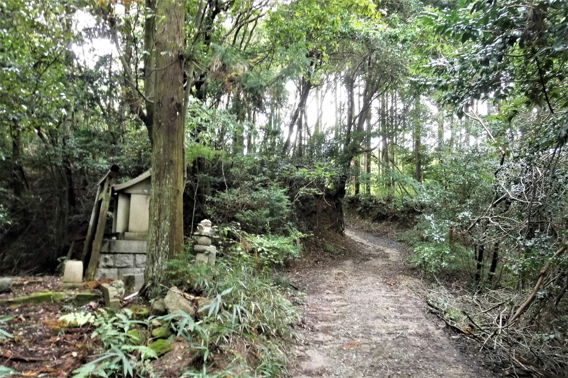 “4駆の坂"に続くここらは、もう登山道といってもよいほどの上り坂。道沿いに小さな祠。狭いが平になっているので、この場所も削平された小曲輪(くるわ)跡なのだろう。