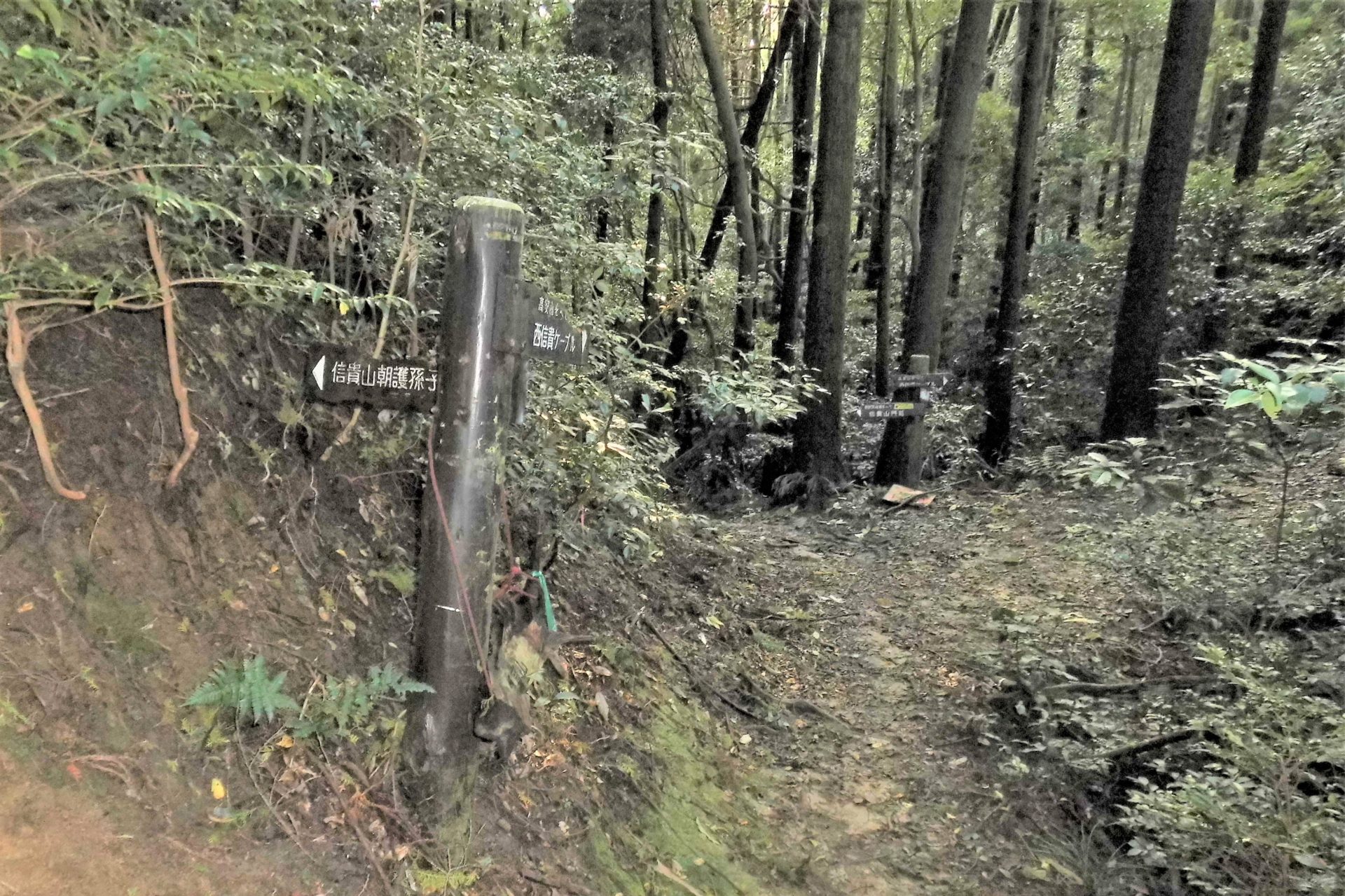 道標に、" 高安山をへて 西信貴ケーブル “の表示 。