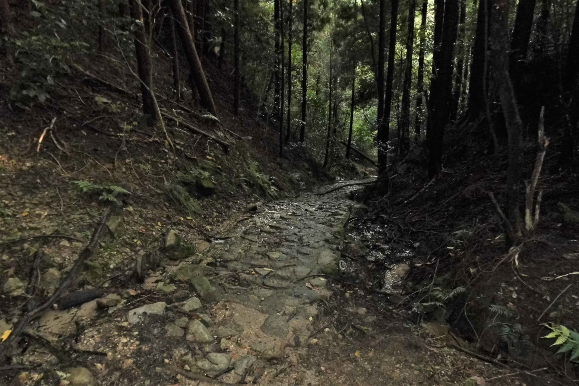 いきなりの急坂、石を選んで、なんでこんな急坂を、階段状ではなく平らな石敷きにしたのだろう⁉❔❓と、ゆっくりゆっくり、、、ボヤキながら下りていく。💦