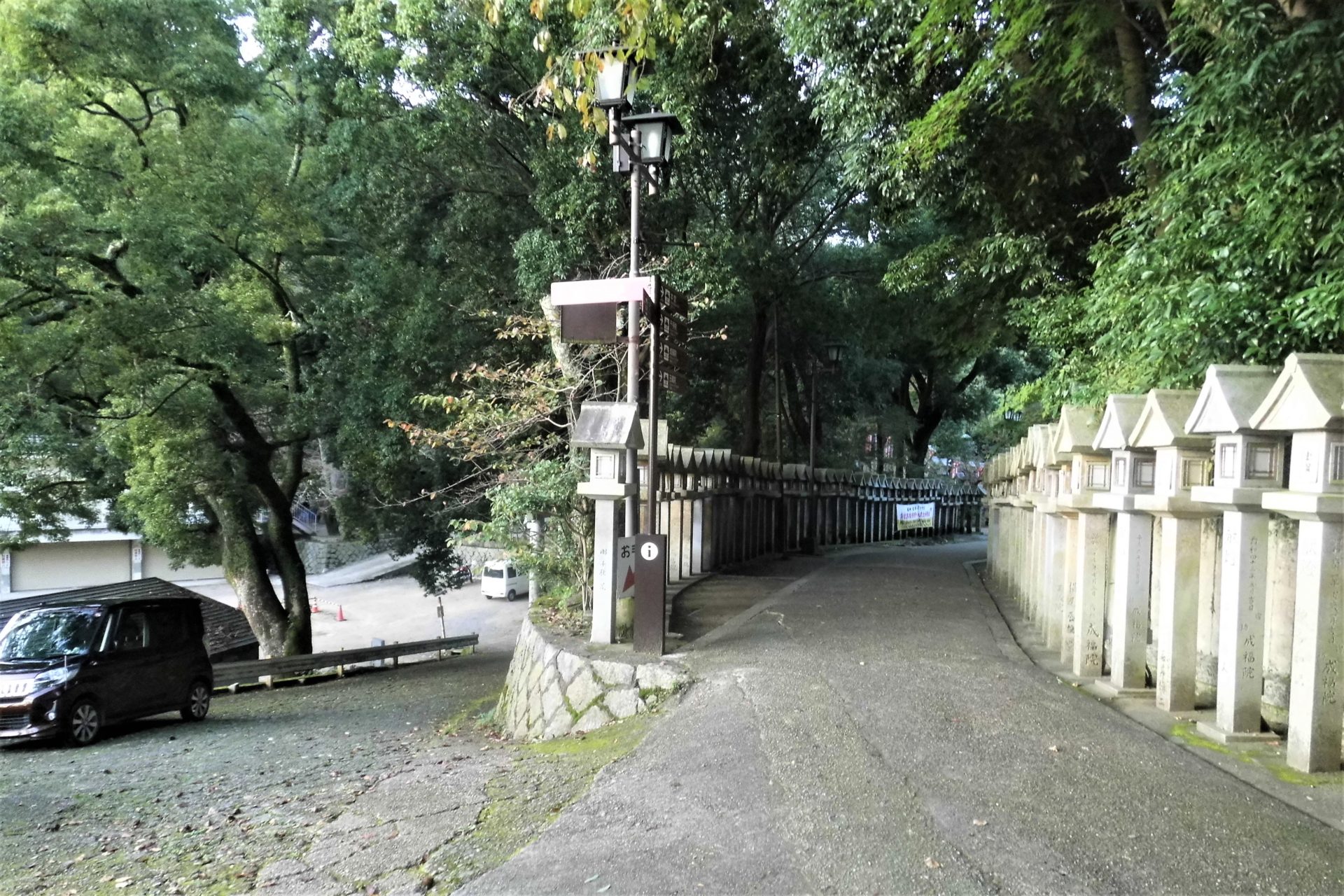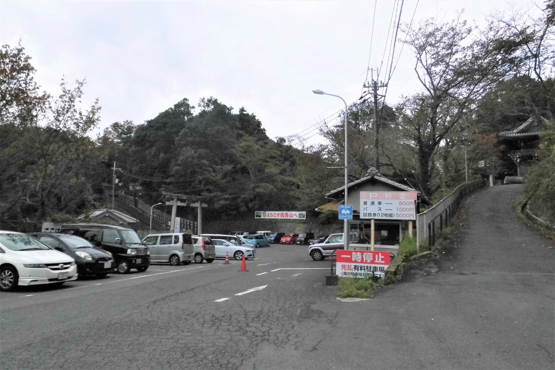 そして信貴山観光 i センター裏手の階段を下りると、写真左側の鳥居から第1駐車場へ。写真右側、坂の上は「仁王門」。