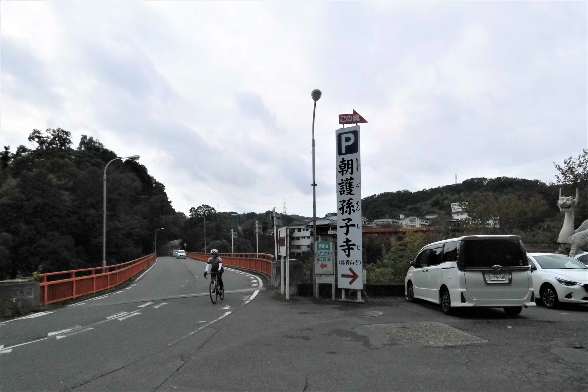 駐車場のすぐ右側の道は、開運橋の下を通って第一駐車場から信貴大橋バス停の在る県道236号信貴山線に。左側の鳥居から上ると最初に通った「大虎」の参道。