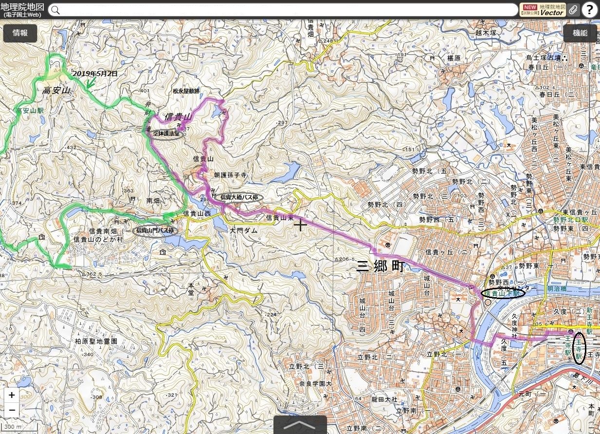 紫ラインが今回のルート。緑ラインは5月20日に高安山を周ったハイキングルートで、一部コースが重なり、記述された草木の季節の変化も面白いので、参考に。