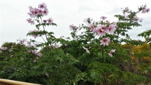 橋の欄干外の両サイド、県道14号桜井田原本王寺線沿いの土手から背を伸ばした皇帝ダリア(ツリーダリア/キダチダリア)に艶やかな花が咲き始めた。つぼみをたくさん付けているし株数も多いので、盛期には花笑み橋をとても華やかに飾ることだろう! 手が届くけど、絶対に摘んじゃあいけません!よ、、「花摘み橋」では有りません (^_-)☆
