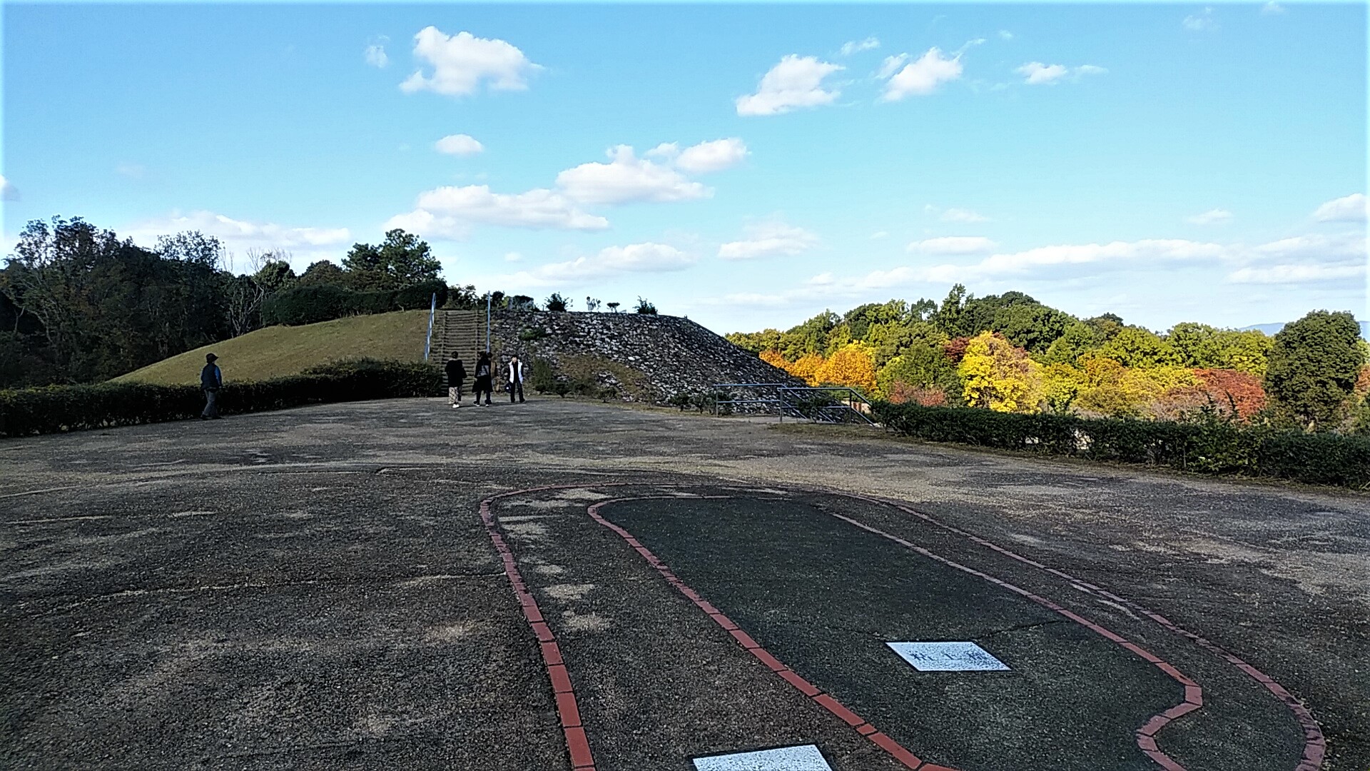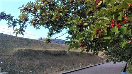 🔹 橋を渡って中央エリアへ。リアルな大きな古墳が現れる、、、「ナガレ山古墳」。過去に、開発による土取で前方部の半分近くが削り取られる事態があったが、橿原考古学研究所や地元団体などの運動により保存され、その後国史跡に指定された。向かいの🚻休憩スポットにクロガネモチ(黒鉄黐)の赤い実が秋の彩りを添えている。