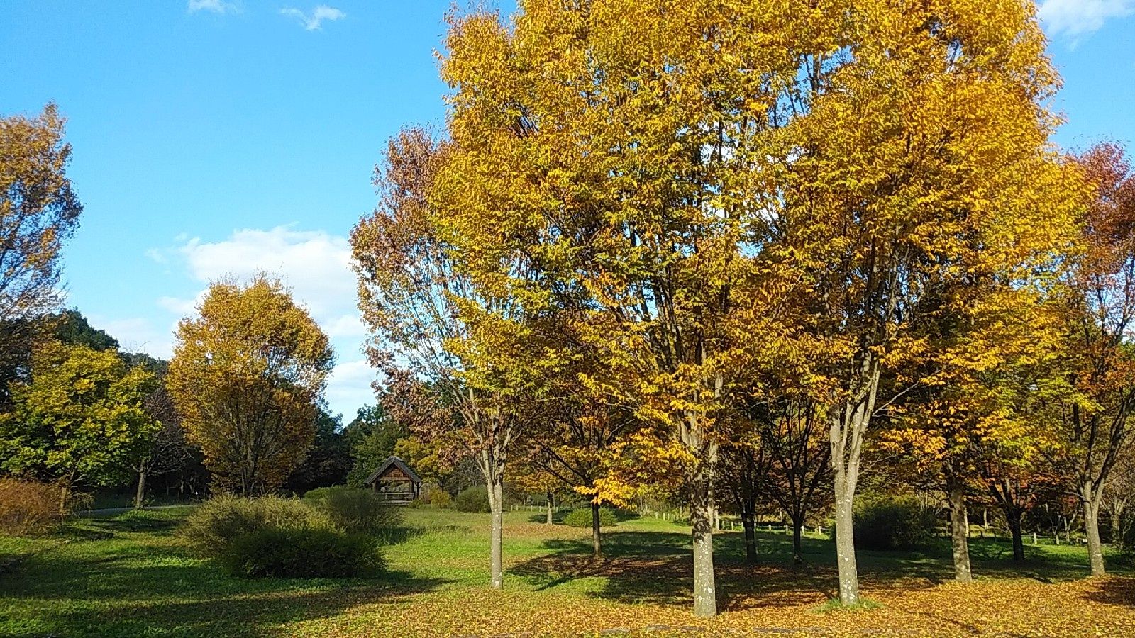 芝生と落葉、木々の緑と紅葉、それらのグラディションの美しい広場に東屋(あずまや)。一幅の絵画のよう、、🎨。「水分(みくまり)広場」。吉野川分水に関わる名称だと思うけど、、、。。