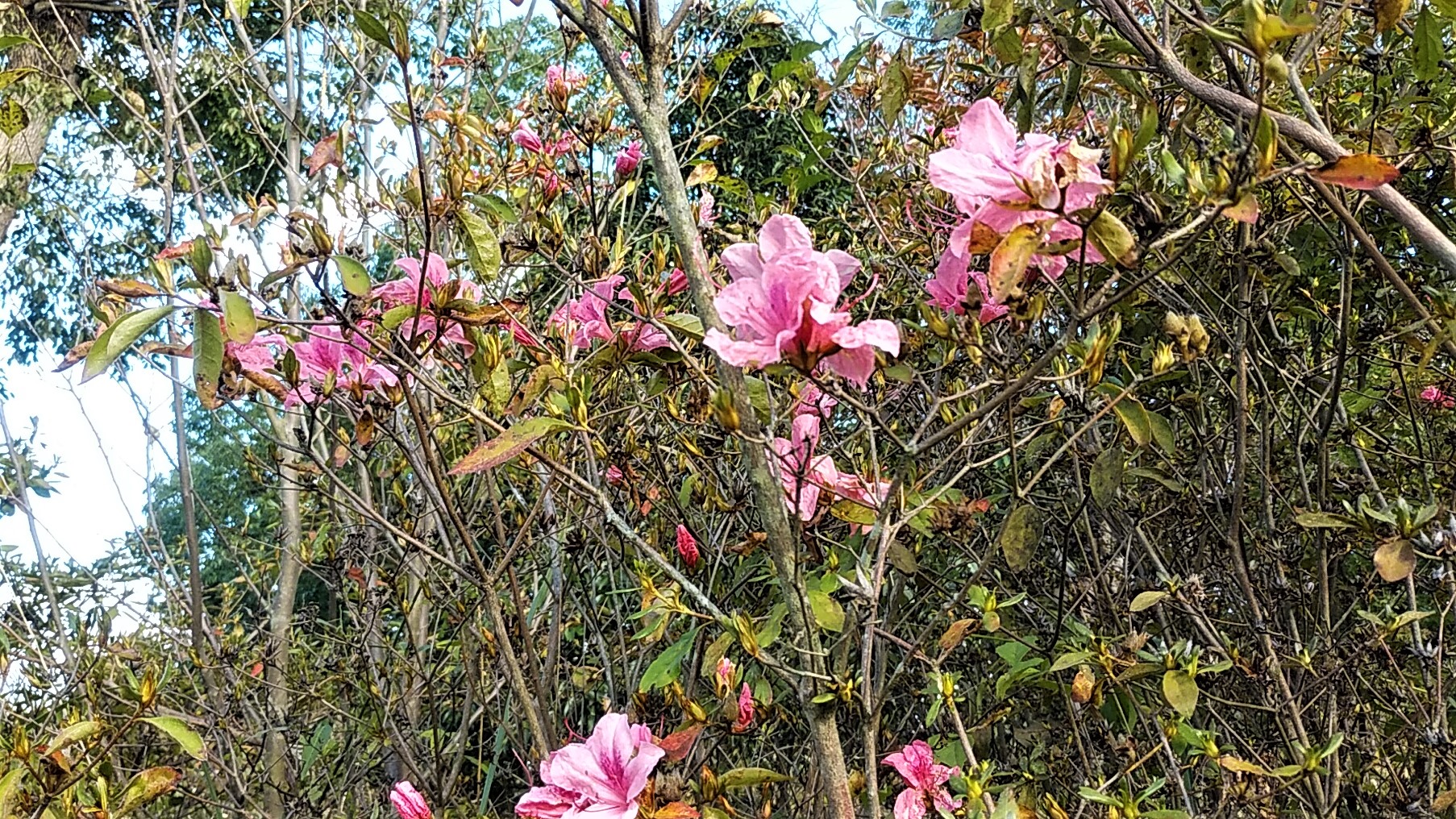 古墳を下りて北へ向かう。沿道のツツジ(躑躅)、この木によくみられる季節外れの開花。