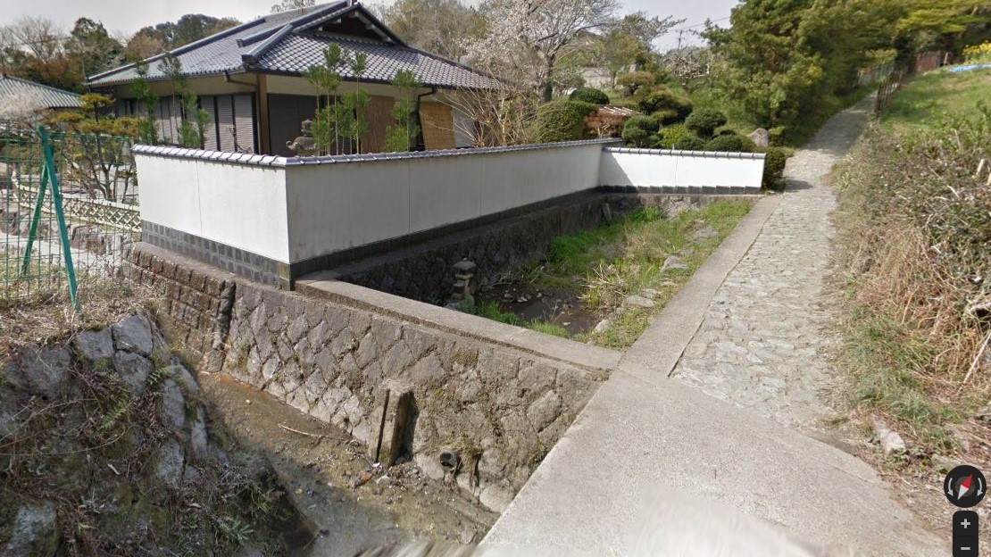 手前が、その「狭井川」。右奥、白壁の先の路傍に後述の歌碑。 (*Googleストリートビューより)