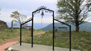 通行止め柵手前の広場、その奥に「祈りの滝」。