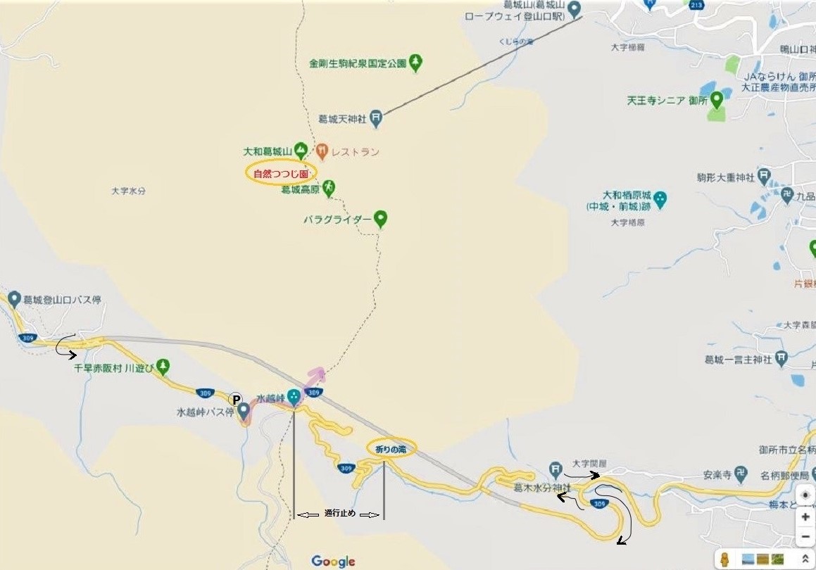 🔹奈良県御所市から国道309号線を水越トンネルを抜けて、千早赤阪村側から水越峠方向へ向かう。旧国道309号線は平成29年台風21号災害により、水越峠頂部から「祈りの滝」前までの、通行止めが継続されている。