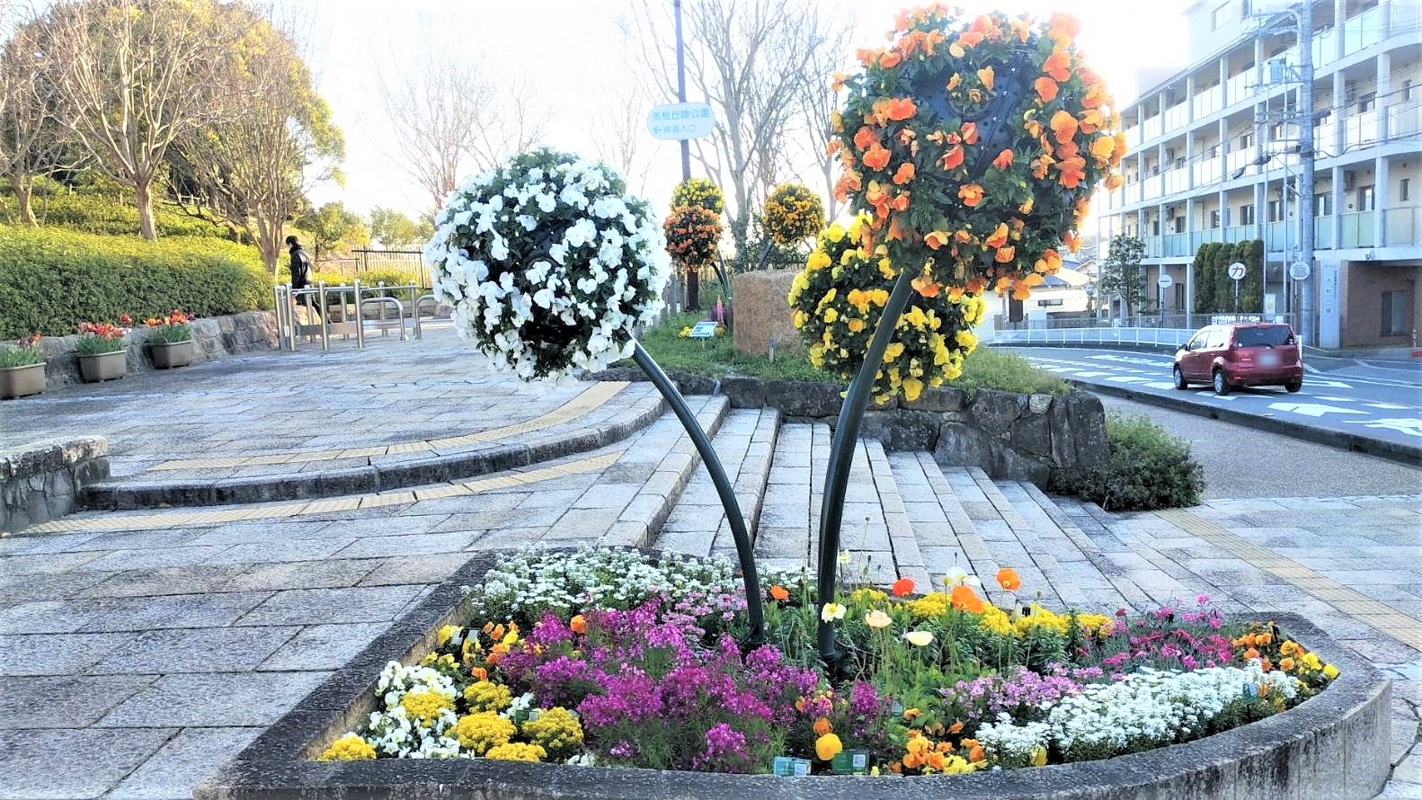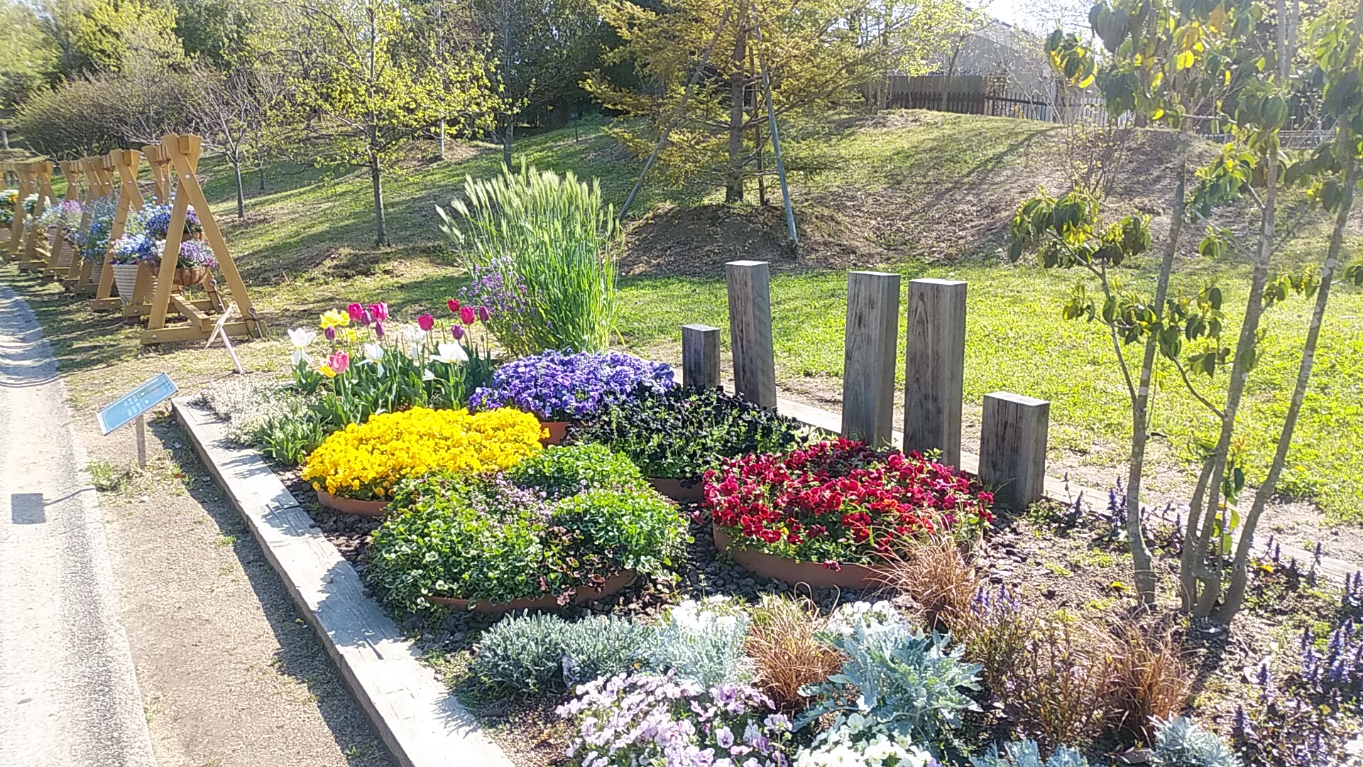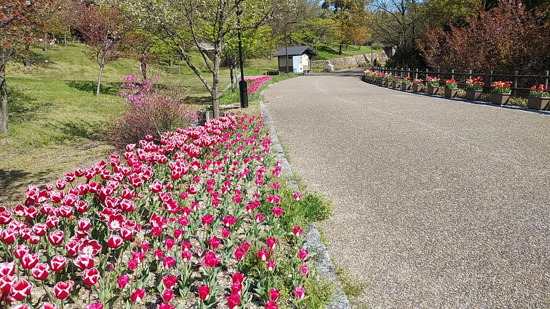 緑道入口の通路は、チューリップのプランターが並び、その西の「眺めの丘」はこれまでのたんぽぽに変わって、鮮やかなチューリップのパッチワーク!!(丘の上から眺めたのがトップ画像)