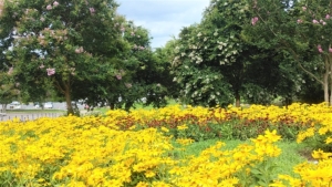 " サンフィニティ " は園内の随所に植栽されているが、ここは古墳の北側堰堤に沿って恐らく150mほどの長さに植えられ、見ごたえがある。